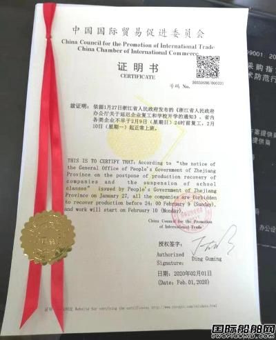 圖:2月2日上午,中國(guó)貿(mào)促會(huì)向浙江湖州某汽配制造企業(yè)出具全國(guó)首份新型冠狀病毒肺炎疫情不可抗力事實(shí)性證明書。