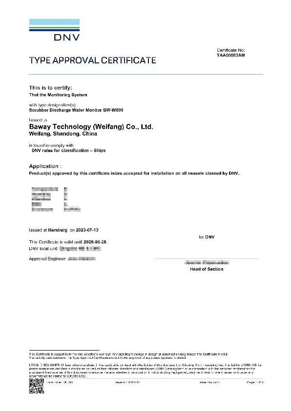 發(fā)布時間:2023-07-21 點擊量:34262023年7月1日,貝威科技有限公司成功獲得挪威船級社(DNV)頒發(fā)的型式認(rèn)可證書,成為中國首個獲得DNV認(rèn)可的脫硫塔洗滌水檢測儀制造商。該認(rèn)證標(biāo)志著中國制造的高端船舶檢測儀器儀表已達(dá)到國際先進水平。