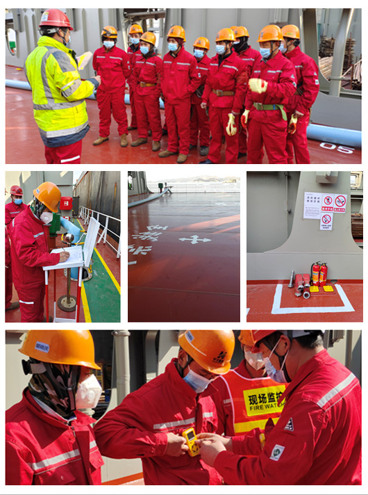 該船進(jìn)廠時(shí)燃料罐內(nèi)剩余300立方的天然氣主機(jī)燃料,公司對(duì)該艙室LNG罐體周圍相連管路系統(tǒng)按要求進(jìn)行惰封處理,艙內(nèi)保持全天候不間斷監(jiān)測(cè),確保測(cè)氧測(cè)爆合格。所有施工人員上船前進(jìn)行了專業(yè)安全培訓(xùn),按要求穿戴防靜電服,并執(zhí)行嚴(yán)格的施工程序。船上危險(xiǎn)作業(yè)點(diǎn)等均設(shè)專職安全監(jiān)護(hù)員,另外,重點(diǎn)加強(qiáng)了對(duì)液貨艙的安全防護(hù),艙內(nèi)所有腳手架均按特涂腳手架標(biāo)準(zhǔn)搭設(shè)和檢驗(yàn)。