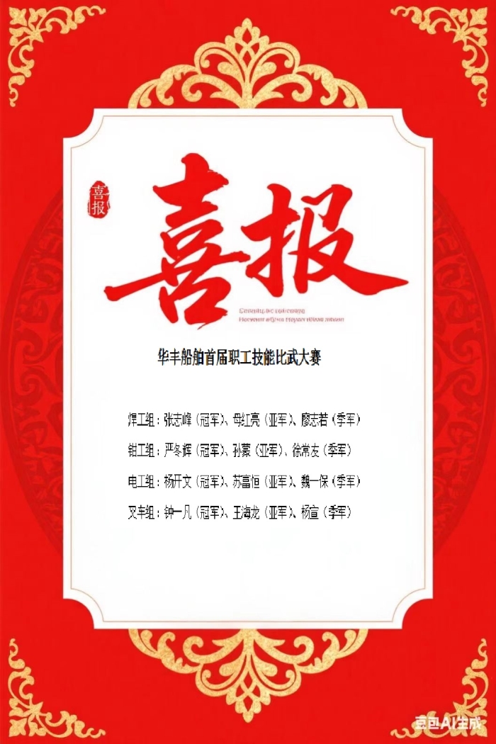 “這是技能的擂臺(tái),更是成長的舞臺(tái)?!贝筚惖某晒εe辦,標(biāo)志著華豐船舶在弘揚(yáng)工匠精神、構(gòu)建人才梯隊(duì)方面邁出堅(jiān)實(shí)步伐。未來,公司將持續(xù)深化"干一行、愛一行、精一行"的企業(yè)文化,讓員工成長與企業(yè)發(fā)展戰(zhàn)略同頻共振,共同書寫高質(zhì)量發(fā)展新篇章!